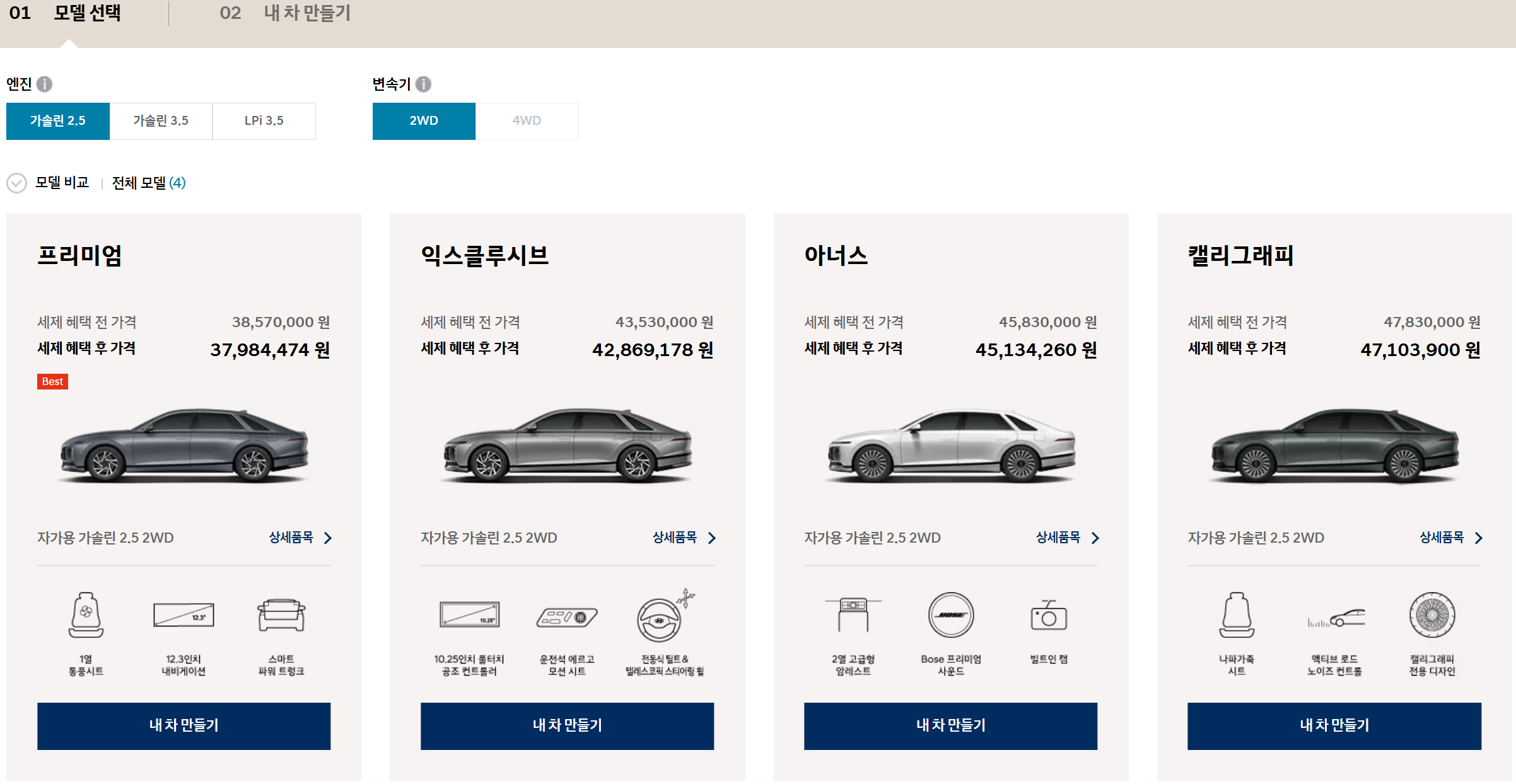 가장 기본인 가솔린 2.5 프리미엄을 기준으로, 엔진을 업그레이드하면 가격이 얼마나 뛸까요? (지갑 사정 고려 타임입니다.)